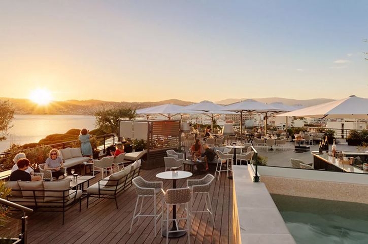 Perché au dernier étage de l’hôtel, le Quinto Cielo est bien plus qu’un simple bar-restaurant : c’est un lieu de vie incontournable à Antibes. Avec sa vue panoramique exceptionnelle sur la baie de Juan-les-Pins, la mer Méditerranée et les montagnes environnantes, ce rooftop est l’endroit idéal pour un dîner romantique, une soirée entre amis ou un afterwork élégant.